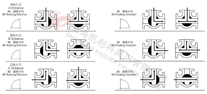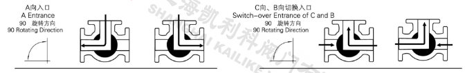 電動三通球閥分L型和T型,介質(zhì)流通方向見下圖。L型電動三通球閥適用于介質(zhì)流向的切換,能使相互垂直的兩個通道連通:T型電動三通球閥適用于介質(zhì)的分流、合流或流向 切換,T型孔道可以使三個通道互相連通或使其中兩個通道連通,電動三通球閥一般采用三個閥座結(jié)構(gòu),亦可根據(jù)用戶要求采用四閥座結(jié)構(gòu)。
